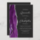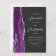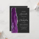 El borde izquierdo de esta elegante y moderna invitación a la boda incluye un borde de ágata color púrpura adornado con un falso purpurina de plata. El texto de personalizable combina guiones de color gris plateado y sans serif en un fondo negro de pizarra. El reverso proporciona espacio para los detalles del boda sobre un fondo negro de pizarra sólida, junto con un código QR que los huéspedes pueden explorar para visitar su sitio web y RSVP, lo que ahorra el coste de imprimir y enviar tarjetas RSVP separadas.