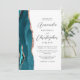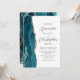 The left-hand edge of this elegant modern wedding invitation features a teal blue watercolor agate border trimmed with faux rose gold glitter. The customizable text combines script and sans serif fonts in charcoal gray on a white background. The reverse side features a matching teal and rose gold agate design.