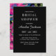 Esta moderna y elegante invitación a la ducha con flores negras y botánicas en forma de novia, presenta flores acuarelas de color rosa, violeta y melocotón y hojas en brillantes tonos verdes con rayas negras y blancas.
