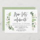 Tarjeta de invitación de boda íntima con tema de jardín de verano con hojas verdes, letra script negra moderna (ahora celebremos). Es perfecta para su recepción de boda íntima / fiesta de celebración después de la boda. Agregue sus detalles en letra negra coincidente.