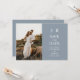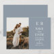 Anuncie su día especial con elegancia utilizando nuestra invitación de guardar la fecha con foto personalizada y monograma azul polvoriento. Esta tarjeta orientada al paisaje presenta un monograma elegante, una foto a la izquierda y texto a la derecha contra un fondo de azul polvoriento calmante. Su diseño simple pero elegante establece el tono para su próxima celebración.