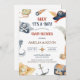 Con un encantador diseño de barco pirata, esta invitación muestra una atrevida paleta de colores de tonos azules profundos y rojos vibrantes. El ilustracion es lúdico e incluye un barco pirata que navega por alta mar, con una bandera Jolly Roger, cofres del tesoro y un mapa, todo ello decorado con detalles náuticos deliciosos. El texto "Ahoy Es un chico!" se muestra en un divertido y aventurero tipo de letra, capturando la emoción de su evento especial.