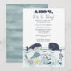 "¡Ahoy, es un niño!" bajo el diseño de Baby Shower con temática marina, presentando hermosas criaturas del mar como ballenas, un caballito de mar, un delfín, un pulpo, una estingria, una estrella de mar y un coral. Los colores principales son azul oscuro y azul oscuro medio con blanco. Con un acento de gris medio, gris, verde salado y amarillo dorado. Un aspecto limpio para la ocasión de la ducha. Diseño compuesto por Hoilday Hearts Designs.