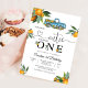 Celebra el cumpleaños de tu pequeño con esta encantadora invitación de primer cumpleaños que presenta un camión azul vintage lleno de naranjas brillantes y rodeado de ramas de cítricos de acuarela. El divertido tema "Nuestro pequeño encanto" añade un toque caprichoso, perfecto para fiestas de verano o celebraciones rústicas. Personaliza con el nombre de tu hijo, los detalles del evento y la información de RSVP para crear un recuerdo que los invitados amarán. Este diseño único combina el estilo rústico con un toque fresco de cítricos, lo que lo hace ideal para baby showers, fiestas de cumpleaños o reuniones festivas.