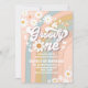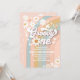 Celebra el hito de tus pequeños con esta invitación retro para el primer cumpleaños. Con rayas de arcoíris pastel, margaritas juguetonas, signos de paz, corazones y estrellas, este diseño captura la divertida vibra de los 70. Perfecta para una fiesta boho o con tema retro, esta invitación personalizable hace que sea fácil compartir todos los detalles importantes con familiares y amigos. Una forma elegante y alegre de establecer el tono para un día lleno de paz, amor y diversión.