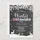 Invitación de cumpleaños de Winter Onederland. Primer cumpleaños. Invitación al 1er cumpleaños de niña. Fondo de pizarra. Blanco y negro. Para una mayor personalización, haga clic en el botón "Personalizar" y use nuestra herramienta de diseño para modificar esta plantilla.