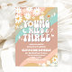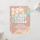 Celebra el día especial de tus pequeños con esta invitación de cumpleaños número 3 inspirada en el estilo retro, que presenta olas pastel juguetonas, signos de paz, margaritas, corazones y estrellas. El diseño audaz y de estilo hippie captura una divertida vibra boho perfecta para niños pequeños que aman temas coloridos y alegres. Personaliza con el nombre de tu hijo, los detalles de la fiesta y la información de RSVP para crear un recuerdo único. Esta invitación de cumpleaños groovy es ideal para fiestas de niñas, celebraciones retro y eventos con temática bohemia.