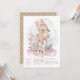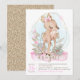 Invitación de baby shower de cierva con adorable cierva bebé con lazo rosa en un bonito fondo floral pastel y brillo dorado. Esta linda invitación de baby shower de ciervo se personaliza fácilmente para su evento.
