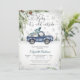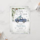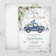 Celebra con estilo acogedor con esta encantadora invitación de baby shower de invierno que presenta un camión vintage azul de acuarela que lleva un árbol de Navidad y regalos. Copos de nieve, ramas de pino y árboles de hoja perenne crean un telón de fondo festivo de temporada, mientras que la elegante letra "Baby it's cold outside" añade un toque caprichoso. Perfecta para celebraciones invernales, este diseño personalizable combina el encanto rústico con la alegría navideña, lo que lo hace ideal para homenajear a los futuros padres durante los meses más fríos.