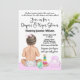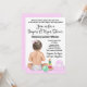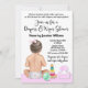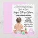 Invitación al baby shower de pañales y toallitas con una adorable bebé con juguetes sobre un fondo de lunares rosados.