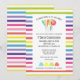 Una dulce invitación para baby shower perfecta para todas las estaciones. Agrega un toque de dulzura y fantasía a tu día especial con nuestra invitación de baby shower a rayas con dulces y golosinas. El diseño presenta nuestras dulces gotas de goma, caramelos y chupetes en frascos de mason con nuestro fondo a rayas a juego. Nuestro exquisito diseño de acuarela seguramente traerá un toque divertido y caprichoso a tu celebración. Prepárate para una dulce celebración en tu evento de baby shower que dejará a todos con un antojo satisfecho.