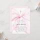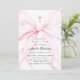Invitación al bautismo de Coquette que presenta un elegante arco rosado y una cruz de oro.