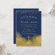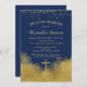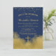 Una elegante invitación al bautismo de color azul marino y oro que incluye un confetti purpurina de oro en la parte superior y un brillo dorado en la parte inferior con una cruz purpurina de oro.