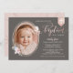 Invitación al bautismo con tu foto con un marco de bonito oval con acentos florales. El diseño presenta un falso oro rosa "Bautismo" en un guión con letras a mano y un cartel con cruz. Simplemente agrega tu texto con las plantillas proporcionadas.