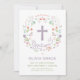 Esta elegante y bonito invitación a bautizar presenta una corona floral ilustrada con la palabra "bautismo" que rodea una cruz. El color del texto, el tipo de letra y el mensaje se pueden cambiar a su gusto. La parte posterior de la invitación tiene un fondo púrpura (que se puede intercambiar a cualquier color de su elección) con un patrón de quatrefoil blanco.