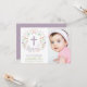 Esta elegante y bonito invitación a bautizar presenta una corona floral ilustrada con la palabra "bautismo" que rodea una cruz. El lado derecho de la tarjeta incluye un área de fotos de personalizable. El color del texto, el tipo de letra y el mensaje se pueden cambiar a su gusto. La parte posterior de la invitación tiene un fondo púrpura (que se puede intercambiar a cualquier color de su elección) con un patrón de quatrefoil blanco.