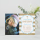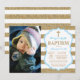 Invitación al bautismo Purpurina Azul y Oro con foto personalizado. Baptismo de chico. Primera Comunión. Cristalización. Dedicación infantil. Bandas doradas y blancas. Para una mayor personalización, haga clic en el botón "Personalizar" y utilice nuestra herramienta de diseño para modificar esta plantilla.