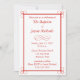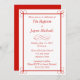 Esta invitación roja personalizado es la manera perfecta de invitar a sus amigos y familiares al bautismo de su hijo. Esta invitación personalizada incluye un elegante borde de desplazamiento y texto rojo. Puede utilizar el ejemplo de invitación de bautismo incluido o personalizar el texto para cualquier otro evento, como una graduación, un boda o una fiesta de cumpleaños. Puede cambiar fácilmente la fuente, el color del texto y el texto de la página de pedido del producto.