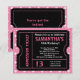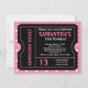 Invitaciones para boletos, rosa y negro con un bonito fondo de starburst en rosa y blanco. Ideal para cualquier chica de edad, adolescente o mujer invitando a fiestas de cumpleaños femeninas. Personalizar con la información de su fiesta. ¡Hace una gran invitación única para cualquier ocasión! Diseñado para parecerse a un verdadero boleto de entrada con falsos recortes y falsedades perforadas, esta invitación audaz y divertida es ideal para una fiesta de cumpleaños a los 13 o cualquier edad.