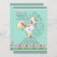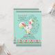 Un lindo conejito de Pascua está en movimiento en esta adorable invitación de temporada. El fondo verde azulado incluye un huevo floral de Pascua y un borde de tulipanes rojos y rosas. (FP)