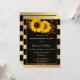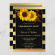 Elegante invitación a la fiesta de compromiso con girasoles, girasoles florales de oro rosa y hojas de otoño sobre un fondo de rayas doradas de moda. Puede elegir otro color de fondo que el negro si lo desea.