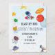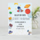 ¡Prepárate para DESPEGAR hacia la diversión con esta adorable invitación de cumpleaños con tema espacial! Con encantadores astronautas de dibujos animados - un gato, un perro y una rana - junto con planetas coloridos, cohetes y estrellas, esta invitación es perfecta para el día especial de tu pequeño astronauta.