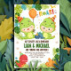 Invitación al cumpleaños de Dinosaur - Esta invitación temblorosa al cumpleaños conjunto ha sido un millón de años en proceso. Con dos felices y pequeños dinosaurios, rodeados de plantas prehistóricas que rondaban cuando los dinosaurios recorrían la tierra. No seas un "rex nervioso". Ayudemos a que la extravagancia de cumpleaños conjunta de su pequeño dinosaurio sea un éxito "rotundo". Totalmente "rugido".