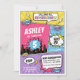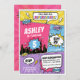 ¡Disfruten de esta invitación de cumpleaños de superhéroes chicas! Es la forma perfecta de invitar a los huéspedes a su fiesta de cumpleaños temática de superhéroes de chica. ¡Esta es la mejor invitación para chicas con un estilo de historieta lleno de acción, con rosas, moradas, amarillas y azules!