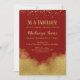 Una elegante invitación de cumpleaños roja y dorada que incluye polvo de confeti dorado en la parte superior y oro en la parte inferior.