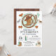 Una "silla" tierno y caprichoso vaquero del oeste salvaje invitación de primer cumpleaños en browns de terracota y blues para un niño, con equipo de vaquero occidental y animales de rancho. Caballo, cabestro, caballos, cactus, montura y lazo. Todo lo que necesita un vaquero. ¡Es su primer rodeo! La parte trasera de la invitación tiene un efecto de madera marrón oscura.