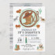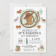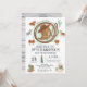 Una "silla de ruedas" tierno y caprichoso vaquero salvaje del oeste invitación de primer cumpleaños en browns de terracota y blues para un niño, con equipo de vaquero occidental y animales de rancho. Caballo, cabestro, caballos, cactus y lazo. Todo lo que necesita un vaquero. ¡Es su primer rodeo! La parte trasera de la invitación tiene un efecto de madera de granero templado. Puedes personalizar esto para cualquier niño de la edad.