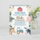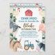 Invitación de cumpleaños para chicos con temática de granja con algunos animales de granja, granero, tractor y un patrón y follaje de yeso azul. Ideal para el primer, segundo o tercer cumpleaños de un niño.