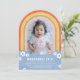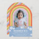 Invite a amigos y familiares a la fiesta de cumpleaños de su hijo con esta sencilla pero adorable invitación de fiesta de temática retro. La tarjeta presenta una foto de un niño enmarcada por un colorido diseño de arco iris. Los detalles del evento se colocan sobre un simple diseño en la nube, y están rodeados por un puñado de días. La parte posterior de la tarjeta presenta un patrón de rayas diagonales en colores coordinados. Esta invitación también sería perfecta para una ducha de bebé.