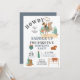 Una "silla de ruedas" tierno y caprichoso vaquero salvaje del oeste invitación de primer cumpleaños en browns de terracota y blues para un niño, con equipo de vaquero occidental y animales de rancho. Caballo, cabestro, caballos, cactus y lazo. Todo lo que necesita un vaquero. Puede personalizar esto para cualquier edad de 1 a 8 años, simplemente agregue el número delante de la palabra cumpleaños. La parte posterior de la invitación es un azul gris ahumado sólido para coincidir con el tipo gris azul del frente.