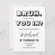 Invitación al cumpleaños de un adolescente Bruh monocromático. Bruh es mi invitación de cumpleaños, cumpleaños adolescente, invitación de fiesta de chicos adolescentes ¡Es hora de celebrar con esta invitación de cumpleaños fiesta! Este diseño minimalista elegante de invitación incluye la palabra "bruh" en negrita delante y en el centro, mientras que también muestra qué actividades serán en su fiesta y una invitación de "Es mi cumpleaños".