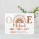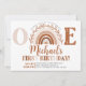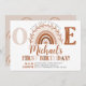 Una divertida invitación al arco iris para el primer cumpleaños con tonos de terracota muda, ideal para un fiesta con la temática del arcoiris boho para el primer cumpleaños de tu pequeño.