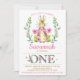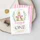 La invitación de primer cumpleaños del chica de Pascua incluye un bonito Conejo Pedro con hojas de eucalipto y flores rosas. Este diseño es ideal para una fiesta de cumpleaños temática de Peter Rabbit.