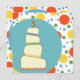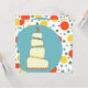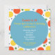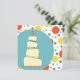 Invitación a una fiesta de cumpleaños de personalizable con un fondo de jóvenes tonos de naranja, verde, amarillo y azul en la parte delantera y trasera. En la parte delantera se muestra el ilustracion de una torta blanca de cumpleaños con cuatro capas redondeadas centradas sobre un gran punto azul. El pastel está decorado con puntos coloridos. Personalizar el número de la parte superior del pastel. Personalice la parte trasera con detalles de su ocasión.