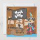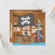 ¡Ahoy matey! Una bandera del cráneo y de los huesos cruzados vuela en la brisa cerca del gran pirata mientras el capitán de pelo rubio se pone de pie vestido con traje pirata, con parche para los ojos y loro! La parte trasera de estas coloridas invitaciones piratas incluye un mapa del tesoro y áreas que usted puede añadir fácilmente todos los detalles de su fiesta de cumpleaños pirata!