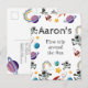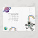 Invitaciones de cumpleaños del primer año con temática de espacio exterior con un fondo de cielo estrellado, planetas del sistema solar dispersos alrededor del borde, una nave espacial, astronauta, y una plantilla moderna de celebración de cumpleaños número 1 que es fácil de personalizar.