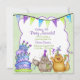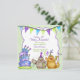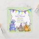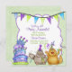 La invitación a la fiesta de cumpleaños neutral, graciosa y graciosa, incluye un par de gatos en gorras fiestas con bebidas y creadores de ruido. Torta de cumpleaños divertida y torcida con velas y pancartas. Los colores principales son verde y violeta. El texto de la parte delantera y trasera de esta tarjeta de diversión está listo para que usted pueda personalizar con la información de su fiesta. La tarjeta de vuelta tiene un diseño similar.