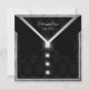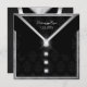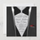 Invitación de Tuxedo puesta sobre un damasco gris perla con guarnecido de aspecto seda y monograma de nudo de amor de diamante acentuado con un bolsillo de pico de seda roja. El reverso de esmoquin delantero con botones de diamante, o mirar de nuevo y es un vino de jerez con tallo de diamante.