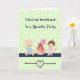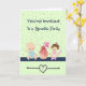 Invitación a un Fiesta Sprinkle. El diseño tiene ilustrados dos bebés, un niño y un chica sentados junto a una gran tarta de copa con rociadores añadidos al fondo. También hay un corazón con salpicaduras en el centro. El fiesta es como una ducha de bebé, pero es para un segundo niño.