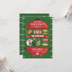 Un hervidor rojo parrilla con todas las golosinas para su fiesta del portón trasero. Entre los artículos de barbacoa y fútbol se incluyen: hot dog, hamburguesa, maíz, casco, yardas, carteles, ketchup, botella de cerveza, tenedor y cuchillo. En la parte trasera de la tarjeta hay un campo de fútbol.
