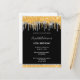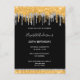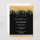 Una invitación moderna, elegante y glamurosa para la fiesta de cumpleaños número 50 (o cualquier edad) de una joven. Un fondo negro de moda con un elegante goteo en purpurina de oro falso y plata, con pinturas que gotean. Personalice y agregue un nombre y detalles del fiesta. El nombre está escrito con un guión de estilo moderno con letras a mano. Letras grises claras. Sugerencia: Si no desea que se vea como una postal, haga clic en personalizar, vaya a la parte posterior y quite el separador y el sello postal.