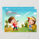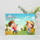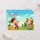 Una linda escena que representa a un niño y un chica en el pinto verde. El campo tiene palmeras y cactus bajo un cielo azul. Ideal para una fiesta de cumpleaños de minigolf juvenil.La invitación es fácil de personalizar con su redacción, fuente, color de fuente y elección de seis tipos de papel.