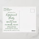 Esta elegante y moderna tarjeta postal del Relieve metalizado de oro tropical "Engagement Party" es una manera fácil de invitar a amigos y familiares para celebrar su compromiso. "Partido de compromiso" junto con los nombres, fecha y ubicación de la pareja aparecen en el frente en el color de Relieve metalizado de su elección. El texto está resaltado por un marco estropeado. Las hojas tropicales, el follaje y los helechos alcanzan su punto máximo por detrás del marco. Las salpicaduras de Relieve metalizado dorado le dan un toque sofisticado de luminosidad al diseño. La parte trasera de la postal tiene los detalles de la fiesta de compromiso en verde oscuro.