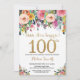 Invitación de cumpleaños número 100 para mujeres. Flor floral acuarela.Brillantina dorada. Rosa, Amarillo, Naranja, Flor Púrpura. Cumpleaños de adultos.