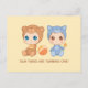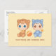 Bebés personalizados en enterizos animales. La de la izquierda está vestida con un traje de salto de oso marrón con una buna amarilla y una abeja minúscula. El de la derecha está vestido como un gato gris y sostiene a un bebé rattle en forma de campana de un gato. La bola brillante descansa entre ellos.