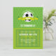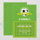Un divertido Fiesta de fútbol o una invitación al partido deportivo en un esquema de color verde, con un ilustracion de fútbol con una red de fútbol y un fondo de campo de fútbol. Perfecto para una fiesta de cumpleaños de niño o chica deportivo.